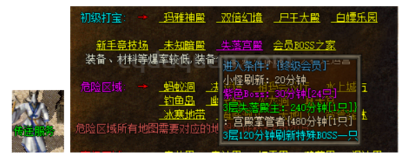 传送员 可以进行传送打宝地图 凭证很好打 用不完 240分钟 480分钟的BOSS都在地图最后一层 未知暗殿在左下角